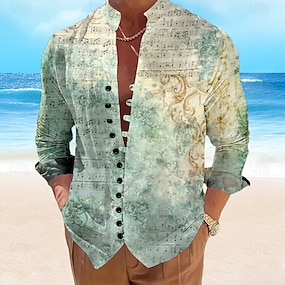 男性用 ペーズリー 音符 コサージュ シャツ スタンドカラーシャツ 長袖 ヴィンテージレトロ バケーション デイリーウェア お出かけ 春 秋 スタンドカラー Band Collar ボタンダウン リネンライクシャツ ブルー グリーン カーキ色