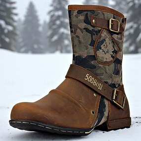 バックルストラップ付きメンズ迷彩レザーミッドカーフブーツ、ミリタリータクティカルスタイルのアウトドアワークシューズ