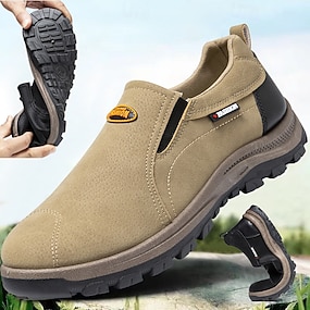 滑り止めの頑丈なソールと黒のアクセントが付いたメンズ ベージュ スリッポン アウトドア シューズ - 毎日の使用に適した快適なカジュアル フットウェア
