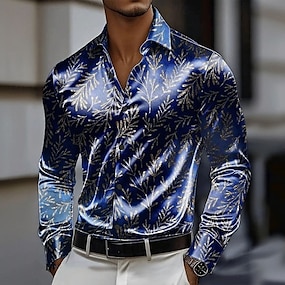 男性用 リーフ柄 植物 サテンシャツ ドレスシャツ ボタンアップシャツ 長袖 ファッションカジュアル バケーション 祝日 夏 春 秋 折襟 襟付きシャツ 3Dプリント ネイビーブルー