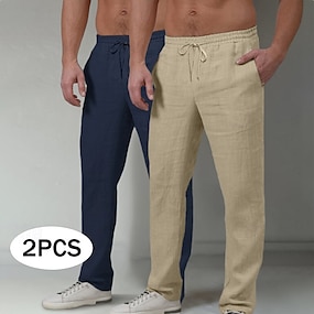 男性用 リネンパンツ ズボン サマーパンツ ビーチパンツ 弾性ウエスト ドローストリング 平織り 履き心地よい 全長 アウトドア カジュアル 日常 旅行度假风 ストリートファッション ホワイト+ネイビーブルー ネイビーブルー+ダークグレー 伸縮性なし