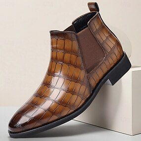 メンズブラウンクロコダイル柄チェルシーブーツ - ビジネス、フォーマルなイベント、普段使いに最適なスリッポンタイプのフェイクレザーアンクルドレスブーツ