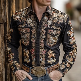 男性用 複雑な花柄 コサージュ シャツ ウエスタンシャツ カウボーイシャツ 長袖 ヴィンテージレトロ アウトドア カジュアル 作業服 春 秋 折襟 フロントポケット2つ リネンライクシャツ ボタンアップシャツ ブラック ブルー