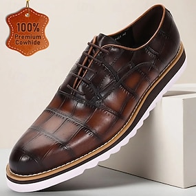 メンズブラウンクロコダイル柄ドレスシューズ - 本革レースアップオックスフォード、結婚式、宴会、イブニングパーティーに最適な高級フォーマルビジネスシューズ