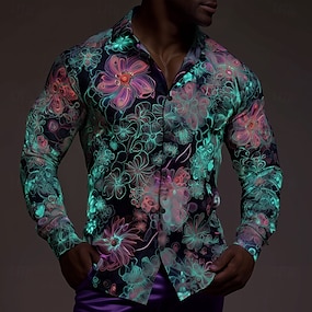 男性用 フラワープリント Neon コサージュ シャツ ボタンアップシャツ カジュアルドレスシャツ 長袖 ハワイアン バケーション 日常 ストリートウェア 夏 春 折襟 3Dプリント 襟付きシャツ ブラック