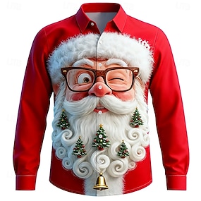 クリスマス 男性用 サンタクロース 3Dカトゥーン 人間の顔 シャツ ボタンアップシャツ 長袖 おかしい アウトドア 祝日 春 秋 折襟 3Dプリント 襟付きシャツ 赤1 ブラック ルビーレッド