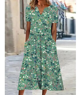 女性用 ミディドレス シフトドレス サマードレス プリントドレス 活発的 ファッション ストリートファッション アウトドア バケーション デート レギュラー フラワー 半袖 Vネック ブルー グリーン グレー 夏 春