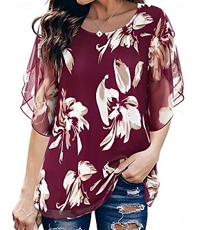 女性用 シャツ ブラウス フラワー カジュアル 七分袖 クルーネック レギュラートップス 日常 メッシュ パッチワーク プリント ブラック ワイン ブルー 夏 春