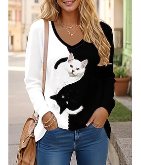 女性用Tシャツ 長袖 グラフィック アニマル 猫 ヴィンテージ スタイリッシュ クラシック 長袖 Vネック レギュラートップス デイリープリント ブラック 春 秋 プレフォール