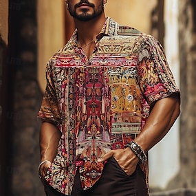 男性用 インディアン(ネイティブアメリカン) ボヘミアン エスニック シャツ アロハシャツ ボタンアップシャツ 半袖 ハワイアン バケーション 祝日 ビーチウェア 夏 春 折襟 3Dプリント 襟付きシャツ ルビーレッド