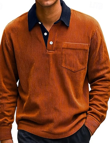 男性用 コーデュロイシャツ ゴルフシャツ ワーク カジュアル ラペル 長袖 ベーシック 近代の カラーブロック ボタン 春 秋 レギュラー ブラック ホワイト ルビーレッド ネイビーブルー ブルー オレンジ コーデュロイシャツ