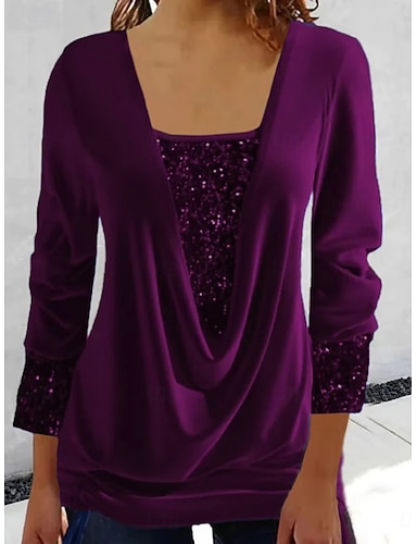 クリスマス レディース ベルベット ブラウス 無地 エレガント スタイリッシュ 基本 長袖 クルーネック レギュラー トップス デイリー スパンコール パッチワーク ブラック ネイビーブルー ロイヤルブルー パープル 春 秋 冬