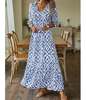 女性用 マキシドレス カジュアルドレス スイングドレス A ラインドレス カジュアル 日常 レギュラー グラフィック 七分袖 Vネック ブルー カーキ色 アーミーグリーン 夏 春 秋