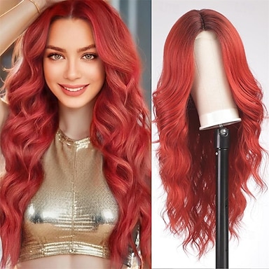 前髪付きロングウェーブウィッグ 25 インチ ブラックオンブルレッド 合成かつら ハートレジアタントウィッグ 女性用 デイリーパーティー コスプレ使用