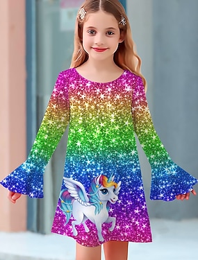 女子 3D グラフィック ユニコーン ドレス 長袖 3Dプリント 夏 春 秋 バケーション スポーツ 日常 かわいいスタイル カジュアル 美しい 子供 3〜12年 カジュアルドレス A ラインドレス 膝上 レギュラー