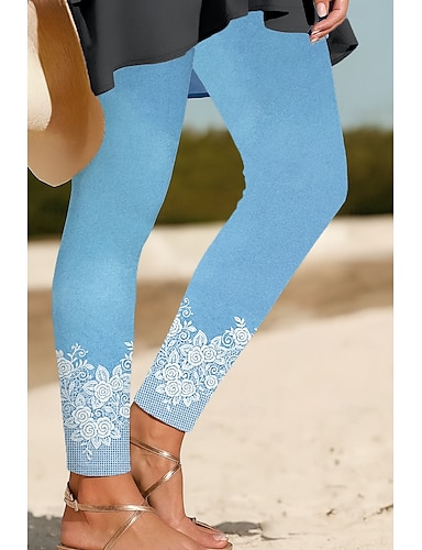 ウィメンズ レギンス カプリパンツ 高い弾力性 バケーションファッション ハワイアン アンクル丈 ミッドウエスト フローラルプリント サーマル 保温性 通気性 ソフト バケーション カジュアル デイリー ロビンズエッグブルー レギュラーフィット