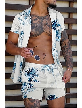 男性用 ココナッツの木 熱帯植物 2個 シャツセット アロハシャツ 半袖 ショートパンツ 折襟 トロピカル風 ファッション ハワイアン ストリート カジュアル 祝日 プリント 夏 春 イエロー ピンク ブルー
