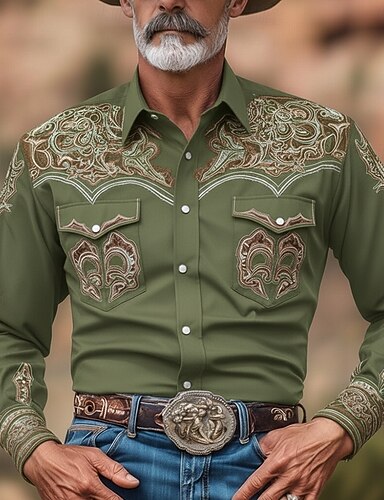 男性用 エスニック 複雑な花柄 コサージュ シャツ ウエスタンシャツ カウボーイシャツ 長袖 ヴィンテージレトロ アウトドア カジュアル 作業服 春 秋 折襟 フロントポケット2つ リネンライクシャツ ボタンアップシャツ ブラック ホワイト アーミーグリーン ルビーレッド ブルー
