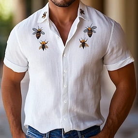 男性用 リネンシャツ サマーシャツ ビーチウェア ボタンアップシャツ ミツバチ バケーション 祝日 ホワイト ピンク ブルー 半袖 折襟 夏 春 衣類