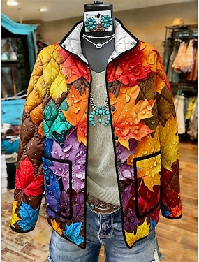 女性用 冬物ジャケット キルティングジャケット 保温 ライトウェイト ボタン プリント 活発的 ヴィンテージ アーティスティック カジュアル リーフ柄 カジュアル レギュラー スタンド レギュラー 長袖 アウターウェア オレンジ 秋 冬