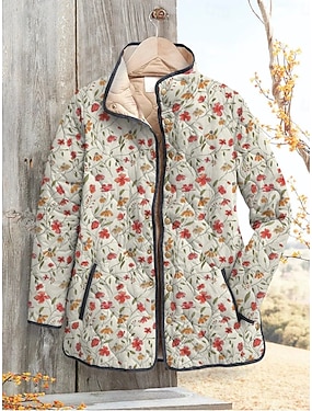 女性用 冬物ジャケット パフジャケット 保温 快適 ポケット ボタン プリント ファッション 日常 屋外 フラワー バケーション カジュアル 日常 シングルブレスト レギュラー スタンド レギュラー 長袖 アウターウェア ルビーレッド ダークグリーン グリーン 秋 冬