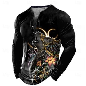 Halloween 男性用 ドラゴン 3D ヘンリーシャツ Tシャツティー 長袖 Tシャツ 3Dプリント レースアップネック ヘンリー シャツ ファッション カジュアル ヴィンテージレトロ ストリート カジュアル 日常 ブラック ルビーレッド ブルー 夏 春 春夏 衣類 S M L XL XXL XXXL