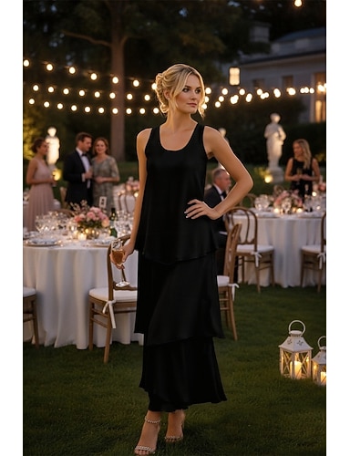 タイト/コラム アンクル丈 ウェディングゲストドレス フォーマルドレス ティアードワンピース マダムドS ノースリーブ Vネック エレガント シンプル 結婚式のゲスト セミフォーマル シフォン 〜と 多層 ソリッドカラー