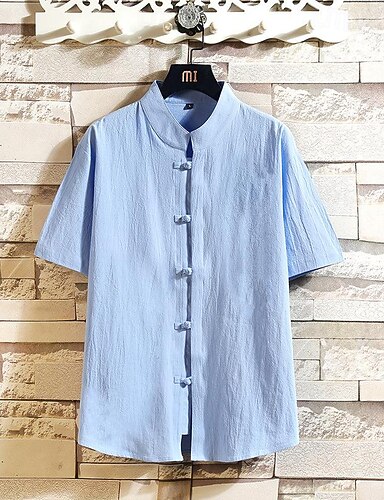 男性用 シャツ チャイナカラーシャツ マンダリンカラーシャツ サマーシャツ カジュアルシャツ ビーチシャツ ブラック ホワイト ブルー カーキ色 半袖 平織り スタンドカラー バケーション 祝日 衣類 ポリエステル ファッション 中国風 カジュアル 快適