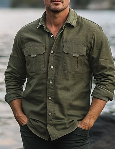 男性用 シャツ ボタンアップシャツ カジュアルシャツ ワークシャツ カーゴシャツ ネイビーブルー グリーン カーキ色 ベージュ 長袖 平織り カラー ストリート 日常 フロントポケット 衣類 ファッション カジュアル 快適