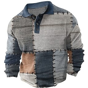 男性用 パッチワーク ワッフルポロシャツ ゴルフシャツ 長袖 ポロシャツ 襟付きシャツ カジュアル フォーマル アウトドア 日常着 ボタン 3Dプリント 春 秋 冬 イエロー ブルー パープル