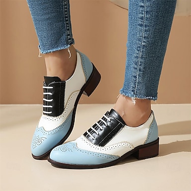 レディース ブラック ホワイト ウィングチップ オックスフォード、ツートン ブローグ ドレスシューズ、ローヒールでスタイリッシュに多用途に着用可能