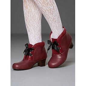 1900年代のビクトリア朝風のバーガンディ色のアンクルブーツ。普段使いやヴィンテージな装いにぴったりの、リボンリボンが付いたフェイクレザーのレースアップヒールブーツ。