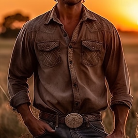 男性用 チェック シャツ ウエスタンシャツ カウボーイシャツ 長袖 ヴィンテージ アウトドア ストリート カジュアル/普段着 秋冬 折襟 ボタン プリント ブラウン