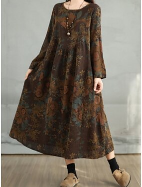 女性用 マキシドレス シースドレス A ラインドレス カジュアル ボヘミアン 結婚式のゲスト 日常 お出かけ レギュラー フラワー グラフィック 長袖 クルーネック ブラウン 春 秋 冬