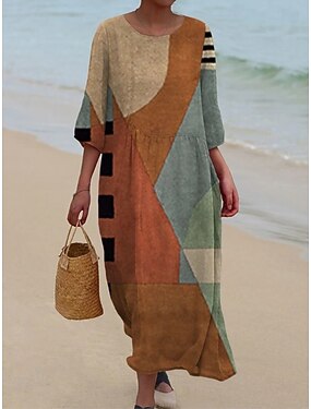 ウィメンズ マキシドレス カフタン 3/4丈袖 クルーネック カジュアル シフトドレス Aラインドレス ボヘミアン デイリー デート 外出 ジオメトリック ダークブラウン イエロー レッド パープル