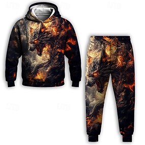 男の子 3D グラフィック オオカミ パーカー&スウェットパンツセット スポーツスーツ トラックスーツ 長袖 春 秋 日常 ベーシック カジュアル 子供 4〜12年 フード付き アウトドア バケーション スポーツ テイラーフィット