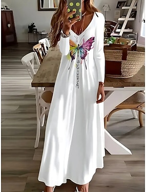 女性用 マキシドレス 白いドレス カジュアルドレス A ラインドレス スタイリッシュ カジュアル 祝日 ルーズフィット グラフィック バタフライ 長袖 Vネック ホワイト 春 秋 冬