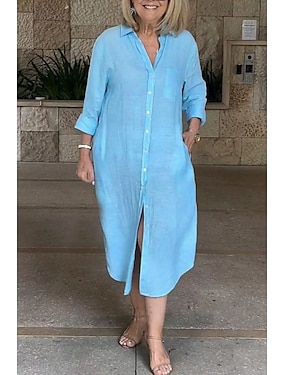 女性用 ロングドレス マキシドレス コットンリネンドレス カジュアルドレス エレガント スタイリッシュ ベーシック バケーション カジュアル 日常 ルーズフィット 平織り 半袖 シャツカラー イエロー ピンク ブルー 夏 春