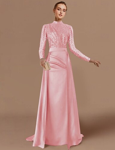 シースイブニングガウンエレガントドレスフォーマルスイープ/ブラストレインロングスリーブジュエルネックスタンにプリーツラッフルスパンコール付き