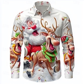 クリスマス 男性用 カートゥン サンタクロース トナカイ シャツ ボタンアップシャツ 長袖 おかしい アウトドア 祝日 春 秋 折襟 3Dプリント 襟付きシャツ 白1 ホワイト