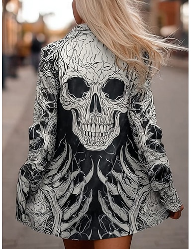 ハロウィン レディース コート 軽量 快適 スカルズ プリント ヴィンテージ アーティスティック カジュアル スカル カジュアル ロング カラーなし レギュラー フィット 長袖 アウターウェア ブラック ダークグレー 春 秋