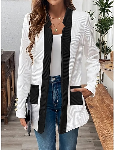 女性用 カジュアルジャケット 快適 高通気性 パッチワーク ボタン エレガント カジュアル 平織り バケーション ストリート カジュアル デイリーウェア オープンフロント ロング スタンド レギュラー 長袖 アウターウェア ブラック ホワイト 春 秋