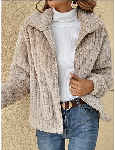 女性用 フリースの上着 テディコート 保温 高通気性 ジッパー ポケット フリースライナー カジュアル 平織り バケーション ストリート デイリーウェア お出かけ ジッパ- レギュラー 折襟 レギュラー 長袖 アウターウェア ブラウン カーキ色 ベージュ 秋 冬