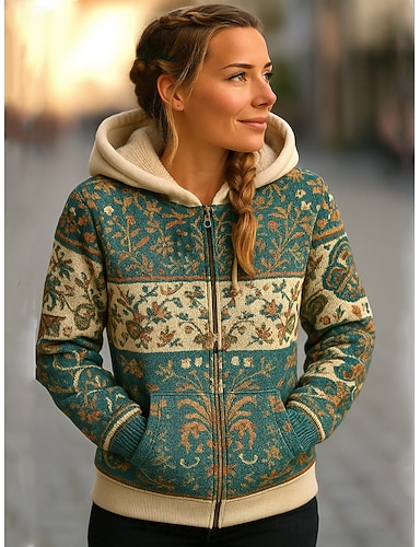 バイキングボヘミアンレディース冬コート暖かい軽量ジッパープリントフリース裏地エレガントヴィンテージファッション幾何学模様在宅勤務カジュアルジッパーレギュラーフード付きルーズフィット長袖アウターウェア