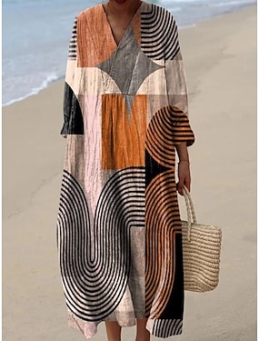 ウィメンズミディドレス Vネック長袖カフタン軽量ルーズフィットAラインドレスカジュアルボヘミアン外出スタンダードフィットグラフィック幾何学的長袖Vネックピンクオレンジアメジスト秋