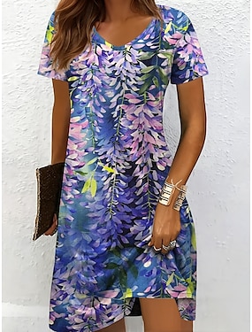 女性用 ミディドレス T シャツドレス A ラインドレス サマードレス 旅行度假风 カジュアル 日常 祝日 デート レギュラー フラワー グラフィック 動物 半袖 Vネック ピンク ブルー パープル ダークブルー 夏 春