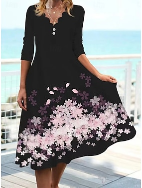 女性用 ミディドレス A ラインドレス カジュアル アウトドア お出かけ スタンダードフィット フラワー 七分袖 Vネック ピンク ブルー パープル 春 秋