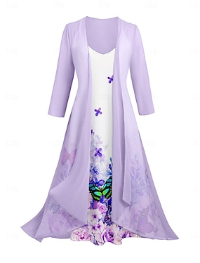 女性用 ドレスセット カジュアルドレス プリントドレス ファッション カジュアル フラワー プリント ミディドレス 七分袖 Vネック アウトドア バケーション ブラック ホワイト パープル 夏 春 ルーズフィット