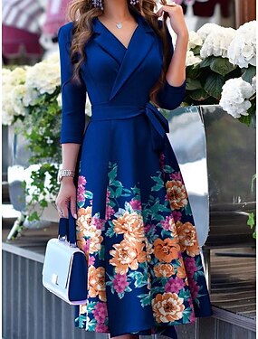 女性用 ミディドレス カジュアルドレス スタイリッシュ カジュアル バケーション パーティー ワーク ルーズフィット グラフィック 半袖 Vネック ロイヤルブルー 夏 春 秋