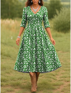 女性用 ミディドレス カジュアルドレス A ラインドレス 旅行度假风 カジュアル レギュラー フラワー グラフィック 長袖 Vネック ルビーレッド ブルー パープル グリーン 春 秋